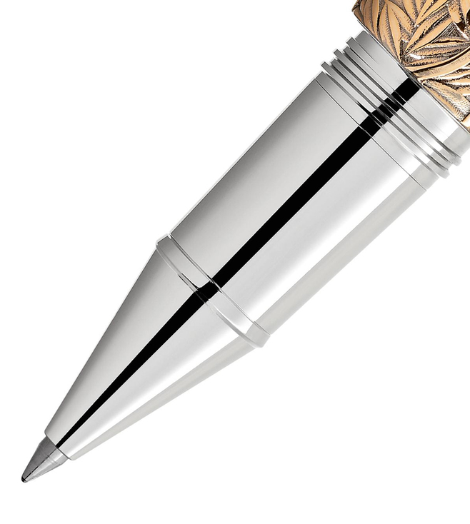 WHY IT’S SPECIAL The Montblanc Writers Edition Homage to Brothers Grimm is dedicated to Jacob and Wilhelm Grimm and celebrates their work on German and European folk tales among which are some of the most famous fairy tales. Made from metal with a special vintage coating, this edition finds inspiration in the story of Sleeping Beauty demonstrated by the twining leaves and thorns around the cap and barrel. The cap is crowned by the Montblanc Emblem in precious Mother of Pearl. The platinum coated clip, surprisingly reveals the silhouette of the profile of the Brothers Grimm. FEATURES COLLECTION NAME Writers Edition COLOR Multi FEATURE1 Cap made from ruthenium-coated metal with vintage yellow gold-coated overlay FEATURE2 Barrel made from ruthenium-coated metal with vintage yellow gold-coated overlay MATERIAL TYPE Metal WRITING INSTRUMENT TYPE Roller Ball