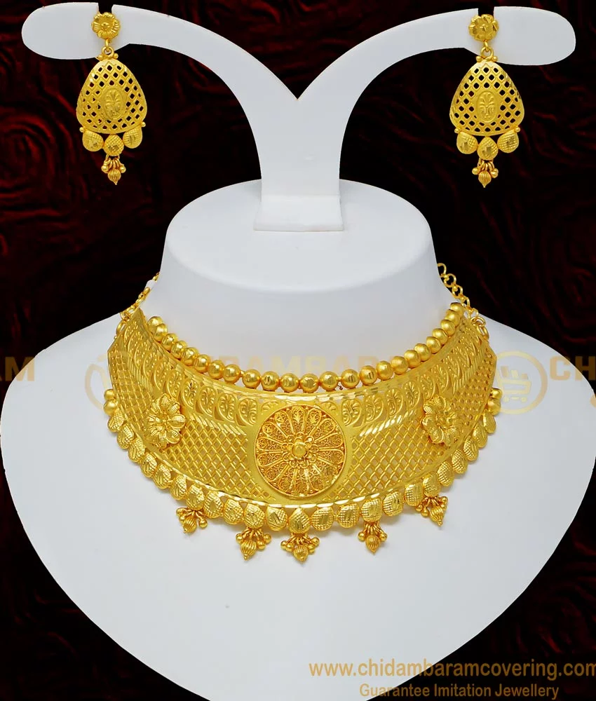 NLC703 - BRIDAL WEAR GOLD DESIGN GOLD FORMING CHOKER NECKLACE WITH EARRING BUY ONLINE